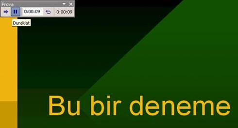 Burada sol üst köşede zaman ayarını gösteren küçük bir pencere açıldı. Bu pencerede istediğimiz kadar bekler ardından duraklat işaretini tıklarız. Bu bölüme verdiğimiz zaman bu kadar. Veya baştaki ok tuşunu tıklayarak ard arda sayfalardaki sunuların zaman ayarlarını yaparız,