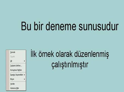 Sayfanın sağ tarafındaki penceresinden istediğimiz sunu örneğini tıklayıp sayfamıza alırız. Biz en basit şekil olan sadece metin içeren ilk örneği seçelim, sonra “Başlık eklemek için tıklatın” penceresine mausumun sol kulakçığı ile tıklayıp silinen yazı üzerine “Bu bir deneme sunusudur”  alt pencereye de “İlk örnek olarak düzenlenmiş ve çalıştırılmıştır” diye yazıp çalıştırdım.