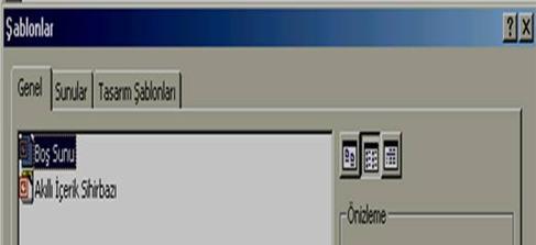 “Genel Şablonlar/Genel/Boş Sunu” komutlarını tıkladıktan sonra karşımıza boş sunu seçeneği açılacaktır. Eğer kullandığımız program Ofis XP ise karşımıza açılacak pencere aşağıdaki gibi bir pencere olacaktır.