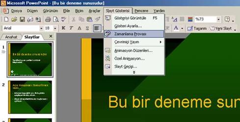 Zamanlama provası: Sunuların nekadar zaman içersinde sunulması gerektiğinin ayarlarını yaparız aynı ayarları biz ana sayfadaki menülerden yaptık ama istersek bu menü ile uygulamalı olarak ta aynı ayarları yapabiliriz. Örnek olarak sunumuzun bir komutunu seçelim ve zaman ayarlarını yapalım.