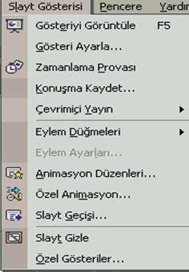 SLAYT GÖSTERİSİ: PowerPoint’in diğer programlardan ayrı tek menusu “Slayt Gösterisi” menusudur. Bu menüdeki komutları tek tek tanımaya çalışalım.